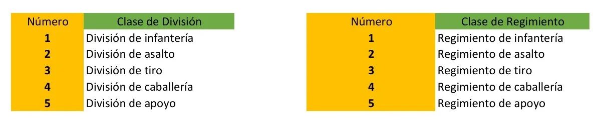 Cuerpos intermedios conformados por 10,000 soldados. Existen cinco tipos de regimientos, numerados del 1 al 10 dentro de cada división.