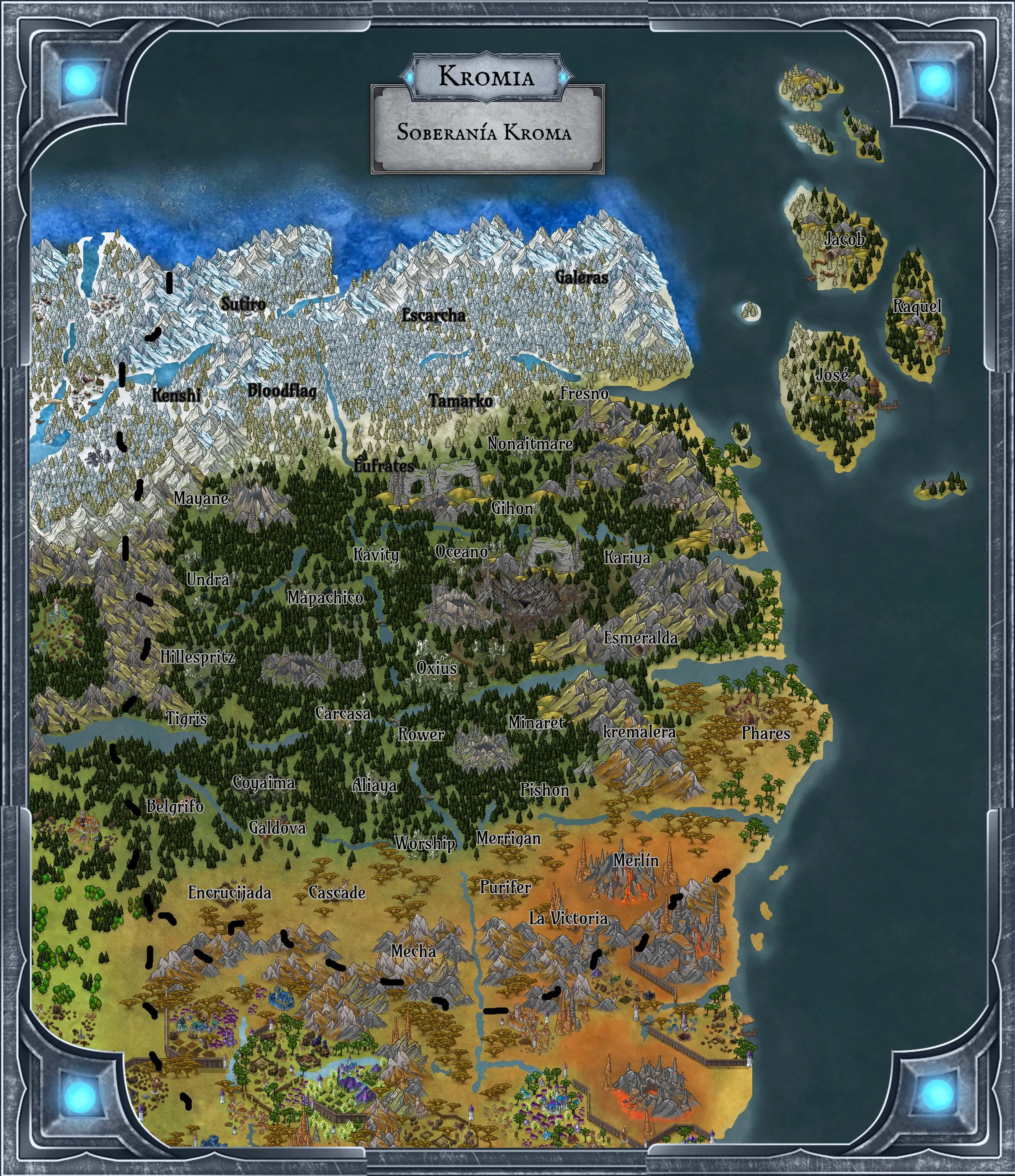 La nación de Kromia abarca una extensión aproximada de 4.25 millones de km², dividida en diversos biomas que dan forma a su territorio.