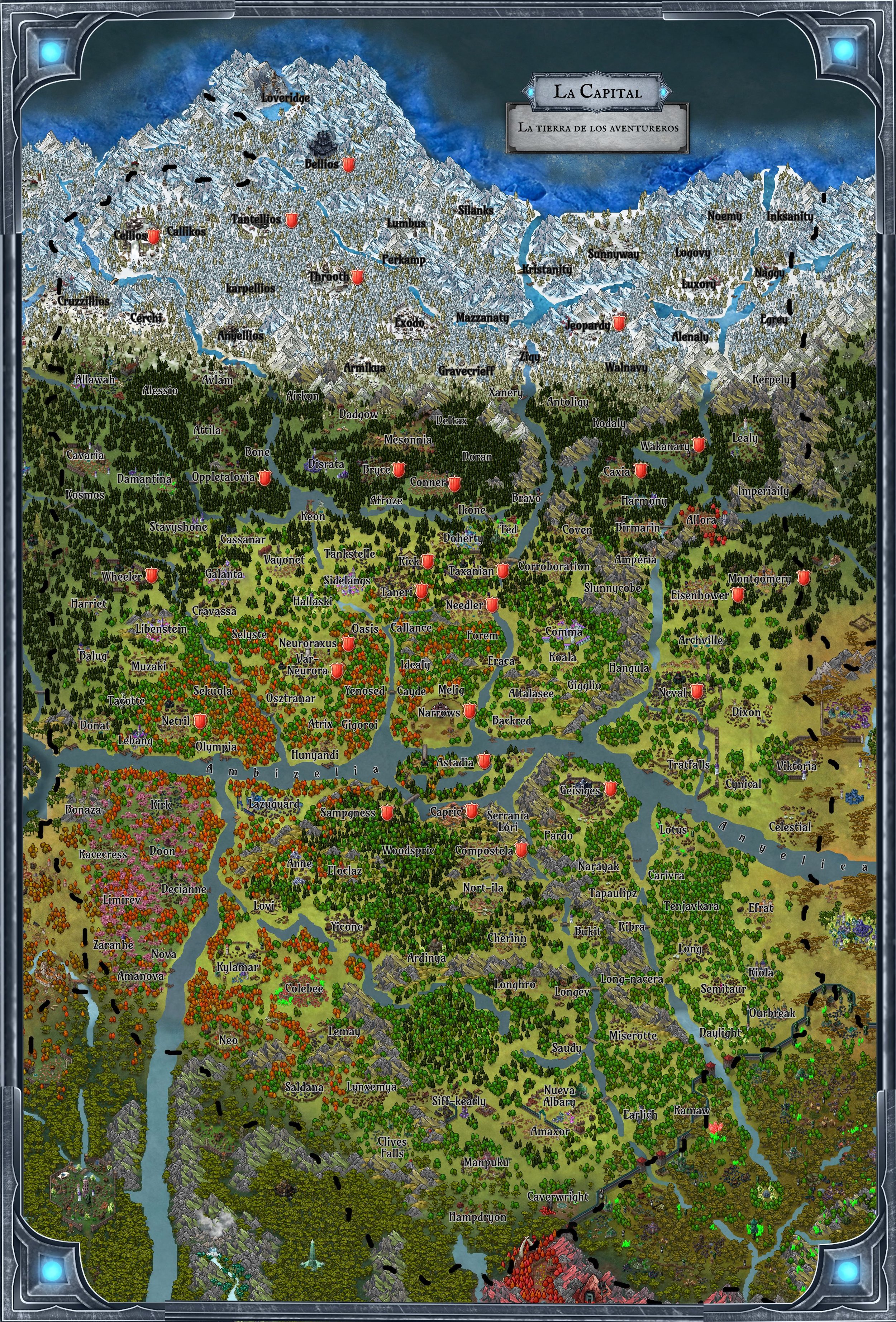La franja norte está dominada por cordilleras cubiertas de nieve, valles congelados y pasos montañosos extensos. Aquí se encuentran ciudades invernales, mineras y puertos como Loveridge, construidas entre glaciares y picos helados. El norte es una zona de difícil acceso, pero de gran valor estratégico.🌲 Bosques Mixtos, Junglas y Cadena de Montañas Boscosas (dispersos, principalmente en la zona central y oriente) 58%